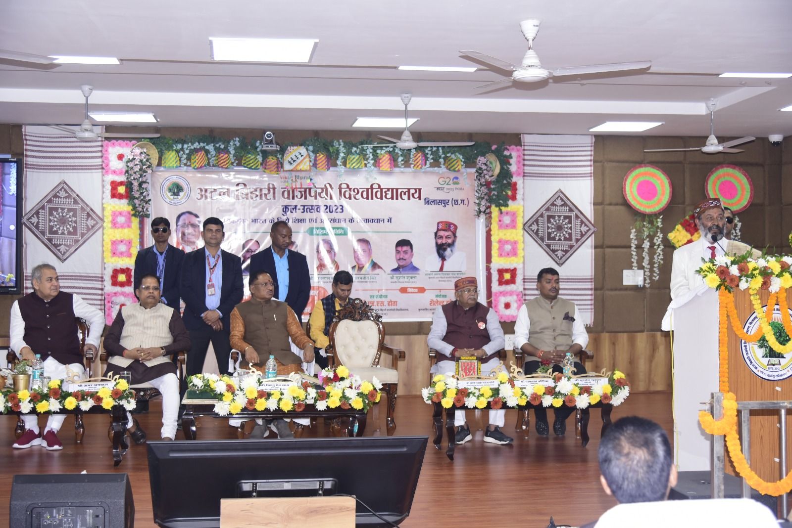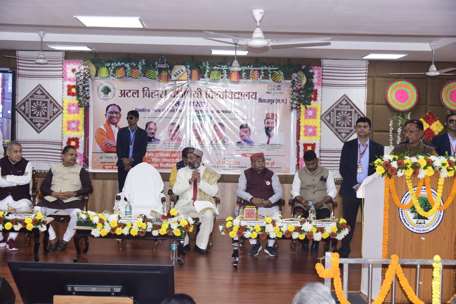 कार्यक्रम को संबोधित करते हुए बेलतरा विधायक सुशांत शुक्ला ने स्व. अटल बिहारी वाजपेयी को नमन करते हुए कि वे एक कुशल राजनीतिज्ञ होने के साथ एक ओजस्वी वक्ता औैर कवि हदय भी थे। वे अपनी राजनैतिक और व्यक्तिगत शुचिता के लिए भी जाने जाते थे। कुलपति आचार्य अरूण दीवाकर नाथ वाजपेयी ने स्वागत भाषण एवं प्रतिवेदन प्रस्तुत किया। उन्होंने पौधे भेंटकर अतिथियों का स्वागत किया। उन्होंने इस अवसर पर विश्वविद्यालय की शैक्षणिक एवं अन्य क्षेत्रों में विशिष्ट उपलब्धियों की जानकारी से समारोह को अवगत कराया। आभार ज्ञापन कुलसचिव शैलेन्द्र दुबे ने आभार ज्ञापन किया। इस अवसर पर संभागायुक्त केडी कुंजाम, आईजी अजय यादव, कलेक्टर अवनीश शरण, एसपी संतोष सिंह, नंदकुमार पटेल विश्वविद्यालय के कुलपति एलपी पटेरिया, सुन्दरलाल शर्मा विश्वविद्यालय के कुलपति वंशगोपाल सिंह, सीवी रमन यूनिवर्सिटी के कुलपति रविप्रकाश दुबे, पूर्व विधायक रजनीश सिंह, भूपेन्द्र सवन्नी, रामदेव कुमावत सहित बड़ी संख्या में विश्वविद्यालय के प्रोफेसर, छात्र-छात्राएं एवं नागरिक गण उपस्थित थे।
