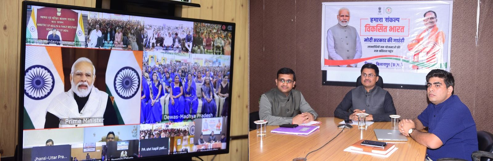 बिलासपुर। प्रधानमंत्री नरेन्द्र मोदी ने वीडियो कॉन्फ्रेंसिग के जरिए विकसित भारत संकल्प यात्रा के लाभार्थियों के साथ संवाद कार्यक्रम में हिस्सा लिया। कलेक्टर अवनीश शरण सहित वरिष्ठ अधिकारियों ने एनआईसी कक्ष से जुड़कर संवाद कार्यक्रम का अवलोकन किया। जिले के ग्रामीण इलाकों में चल रही मोदी की गारण्टी वाली गाड़ी से भी प्रधानमंत्री के संवाद कार्यक्रम का जीवंत प्रसारण सुना गया। ग्रामीणों ने शिविरों में बड़ी संख्या में उपस्थित होकर उत्साह के साथ प्रधानमंत्री के संवाद एवं संदेश को सुना और इसे काफी उपयोगी एवं प्रेरणास्पद बताया। उन्होंने बताया कि मोदी की गारण्टी वाली गाड़ी से हमें बहुत लाभ मिल रहा है। योजनाओं की जानकारी भी मिल रही है। प्रधानमंत्री नरेन्द्र मोदी ने कहा कि मोदी की गारण्टी वाली गाड़ी जहां भी जा रही है, वहां लोगों का विश्वास बढ़ा रही है। लोगों की उम्मीदें पूरा कर रही है। विकसित भारत के संकल्प से जुड़ने और देशवासियों को जोड़ने का ये अभियान लगातार विस्तार ले रहा है।