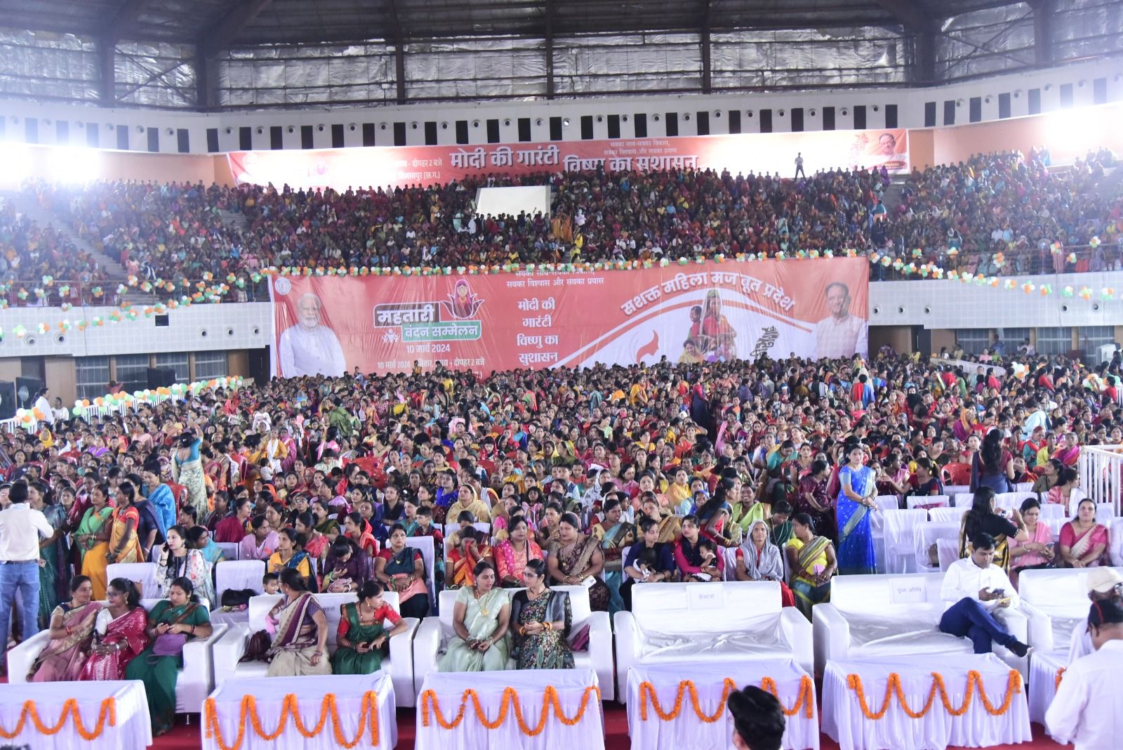 स्टेडियम में महिलाओं का जनसैलाब उमड़ पड़ा, ऊपर-नीचे सहित गलियारों में भी बैठकर महिलाओं ने प्रधानमंत्री नरेंद्र मोदी को सुना।