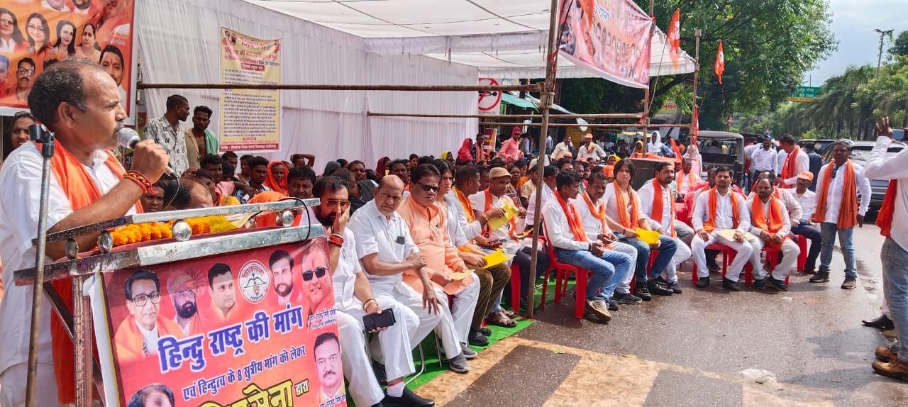धरना स्थल पर प्रदेश प्रमुख धनंजय सिंह परिहार, प्रदेश कार्यकारी अध्यक्ष मधुकर पांडे, महासचिव रेशम जागड़े, प्रदेश प्रवक्ता राधा रमण पांडे सहित कई प्रमुख नेता उपस्थित थे। उन्होंने अपने संबोधन में देश को हिंदू राष्ट्र घोषित करने और हिंदुत्व की विचारधारा को आगे बढ़ाने की आवश्यकता पर जोर दिया।