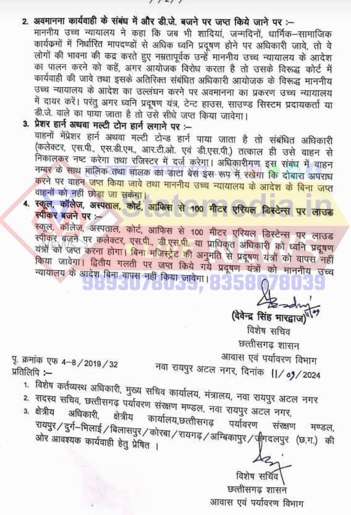 यश विश्वकर्मा @ रायपुर/बिलासपुर। छत्तीसगढ़ में डीजे साउंड सिस्टम से लैस वाहनों पर कड़ी कार्रवाई का रास्ता साफ हो गया है। सुप्रीम कोर्ट के निर्देशों पर राज्य सरकार ने नई गाइडलाइन जारी कर दी है। इसके तहत, अब डीजे साउंड सिस्टम लगाने वाले वाहनों का परमिट निरस्त किया जाएगा। गाइडलाइन का सख्ती से पालन कराने के लिए सभी कलेक्टर और पुलिस अधीक्षकों को निर्देशित किया गया है। ध्वनि प्रदूषण को नियंत्रित करने के उद्देश्य से यह कदम उठाया गया है।