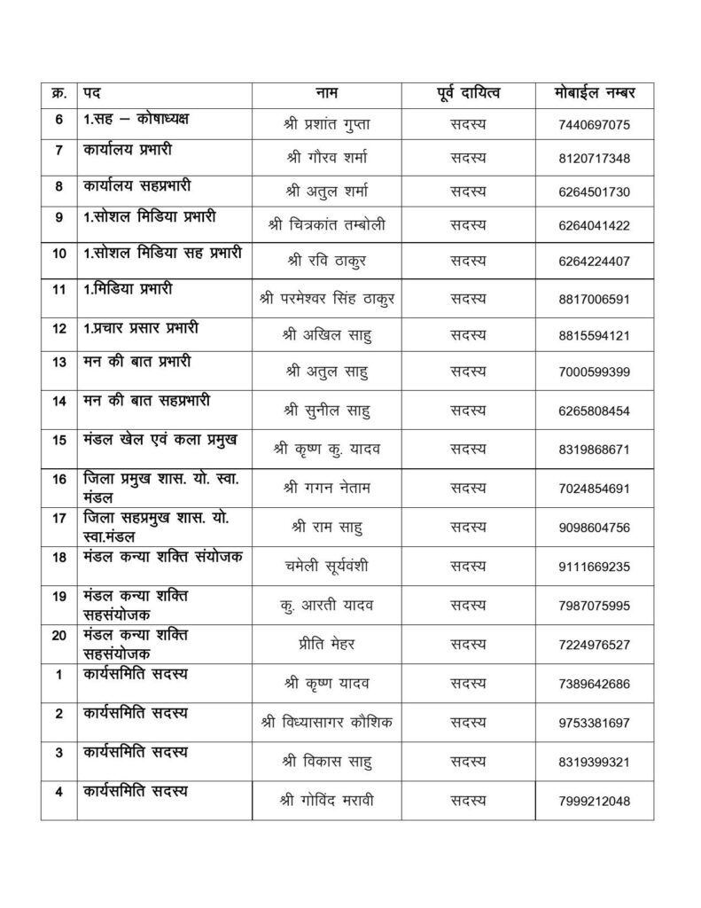 मंडल मंत्री: मनीष कौशिक, नीलकांत दुबे, अनिल साहू, निखिल श्रीवास।