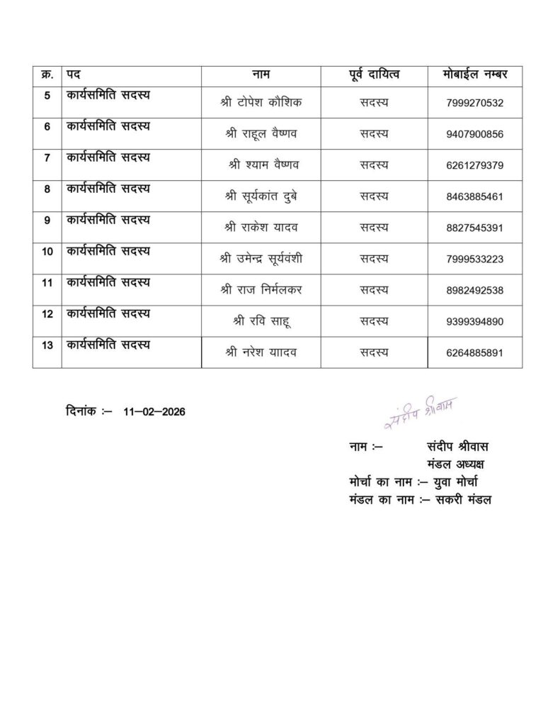 केदार सिंह ठाकुर @ बिलासपुर। भारतीय जनता पार्टी के सकरी मंडल युवा मोर्चा की नई कार्यकारिणी की घोषणा कर दी गई है। जिला इकाई के मार्गदर्शन में जारी सूची में विभिन्न पदों पर कार्यकर्ताओं को जिम्मेदारी सौंपी गई है। नई टीम में संगठनात्मक अनुभव और सक्रियता को प्राथमिकता दी गई है।