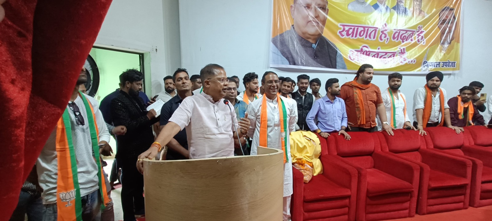बिलासपुर। कांग्रेस ल नेता पिनाल उपवेजा ने अपने डेढ़ हजार युवकों व महिलाओं के साथ बिलासपुर के भाजपा प्रत्याशी अमर अग्रवाल के समक्ष भारतीय जनता पार्टी में प्रवेश कर लिया। खचाखच भरे स्व. लखीराम अग्रवाल स्टेडियम में श्री अग्रवाल ने विश्वास जताया कि इनके समर्थकों सहित भारतीय जनता पार्टी में आने से पार्टी और मजबूत होगी। कांग्रेस नेताओं ने भाजपा में प्रवेश कर कांग्रेस को सबक सिखाने का काम किया है। इस मौके पर आयोजित संक्षिप्त समारोह को संबोधित करते हुए श्री अग्रवाल ने कहा। भाजपा विवाहित महिलाओं को हर महीना एक हजार रूपये तथा साल में 12 हजार रूपये देगी। भूपेश बघेल पर करारा प्रहार करते हुए श्री अग्रवाल ने कहा, रेडी टू इट बनाने वाली स्व-सहायता समूह की महिलाओं से काम छीनकर उन्हें बेरोजगार कर दिया। भाजपा की सरकार में सारी खरीदी इन्ही स्व-सहायता समूह की महिलाओं से किया जाएगा। भाजपा प्रत्याशी श्री अग्रवाल ने कहा कि केन्द्र ने बिलासपुर में दो सौ करोड़ की लागत से एक युवा ट्रेनिंग सेंटर बनाने जा रही है। ट्रेनिंग के बाद युवाओं को रोजगार मुहैया कराया जाएगा। इस मौके पर नितेश गेमनानी सहित बड़ी संख्या मे युवा, महिलाएँ, प्रतिष्ठितजन तथा भाजपा कार्यकर्ता सैकड़ों की संख्या में मौजूद थे।
